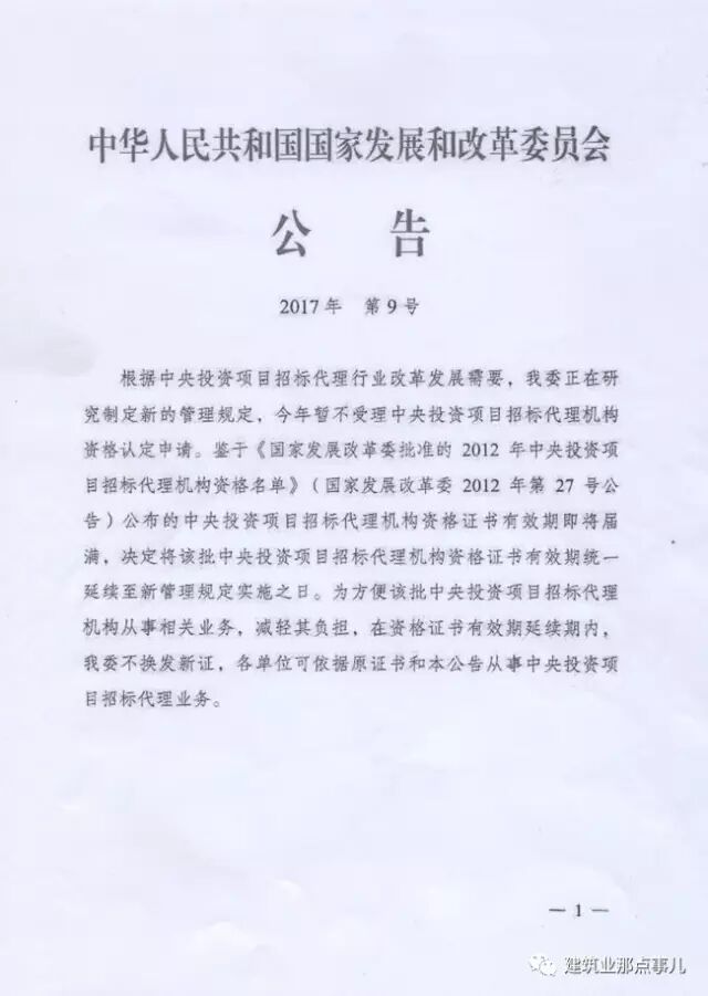 近日国家发展与改革委发布公告:“我委正在研究制定新的管理规定,今年暂不受理中央投资项目招标代理资格认定申请。……资格证书有效期即将届满,决定该批单位资格证书有效期统一延续至新管理规定实施之日。在资格证书有效期延续期内,我委不换发新证”。